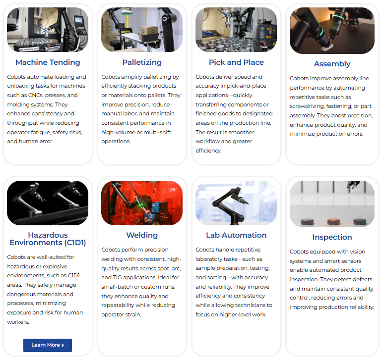 Cobots are common in manufacturing, packaging, metalworking, electronics, and food & beverage—anywhere efficiency, quality, and safety matter.