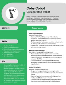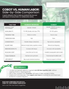Cobots are reshaping modern manufacturing by tackling today’s biggest operational challenges. From increasing labor costs to growing safety requirements, cobots help companies boost productivity, improve workplace safety, and maximize efficiency—empowering your team to achieve more with fewer resources.